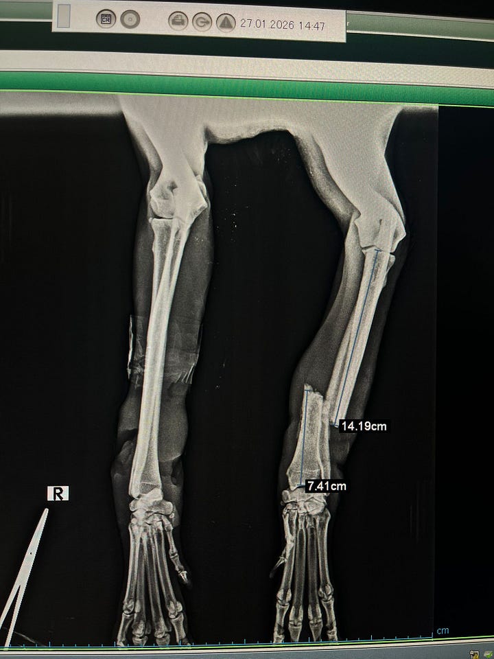 Infection, implant failure, or the bone simply refusing to knit, what vets call a non-union are all risks we have to watch for. The fixator gives him the best possible chance, but it isn’t magic. It’s support, not certainty.