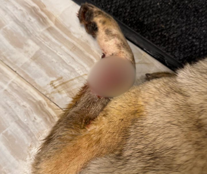 When a dog protects an injured leg for that long, muscles tighten and joints stiffen. Blood flow drops. Tissue becomes inflamed and fragile. For a street dog, there’s also dirt, bacteria, licking all the things you don’t want near a surgical site.