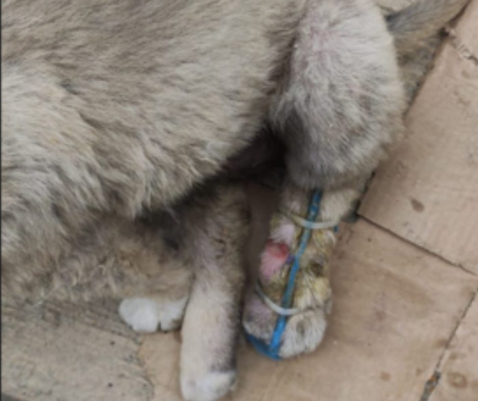 Thankfully, a kind person found her and took her under their protection. However, they lacked the funds for medical care, so they decided to improvise by strapping her broken leg with an iron rod and string.
