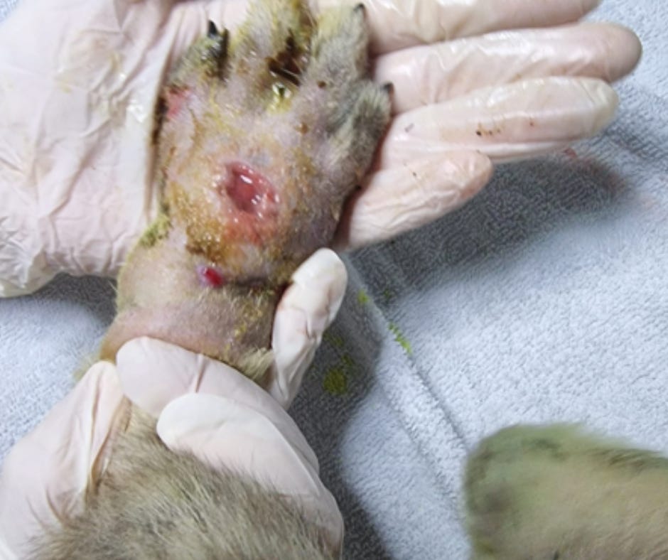 The improperly set bones had fused in a way that required immediate veterinary intervention.