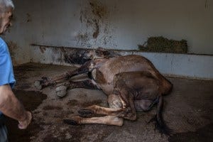 This fighting camel lives in Aydin on a farm. As you can see he is restrained by the head & the leg & lives in a barren building with concrete floors.