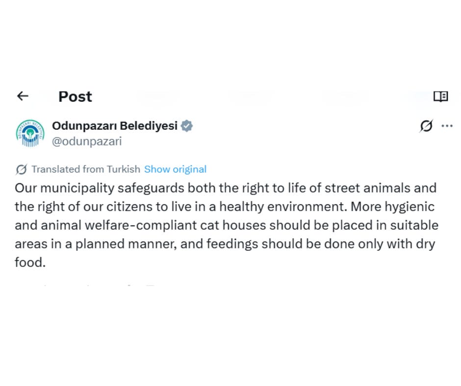 According to local news reports, Odunpazarı Municipality removed several cat houses that had been positioned on streets where community cats were being fed and sheltered by residents.
