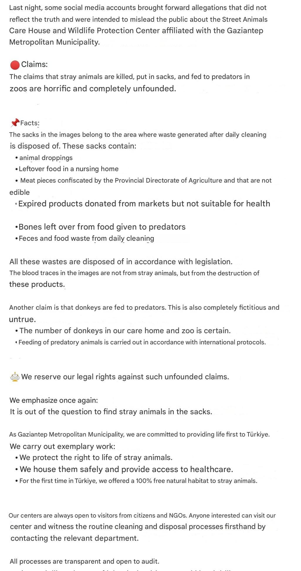 On 13 September 2025, the Gaziantep Metropolitan Municipality issued a formal statement firmly rejecting the allegations. Officials described the claims as both horrific and baseless. They explained that the videos and images circulating online, which purported to show bags of animal remains, had in fact been misinterpreted. According to their statement, the bags contained a mixture of cleaning waste, expired or unsuitable donated meat, confiscated unusable products from the agricultural directorate, and food remnants from predator feedings.