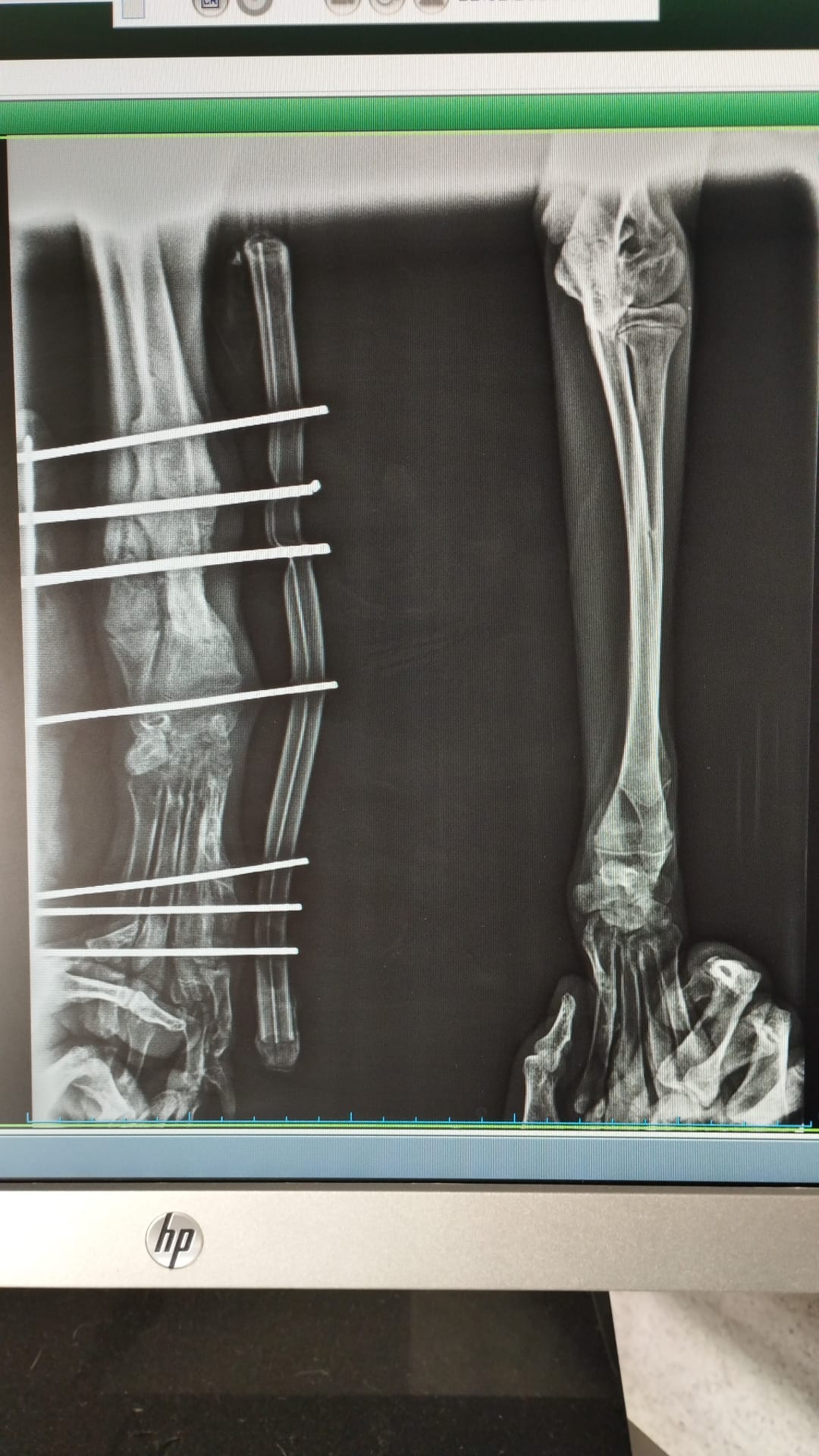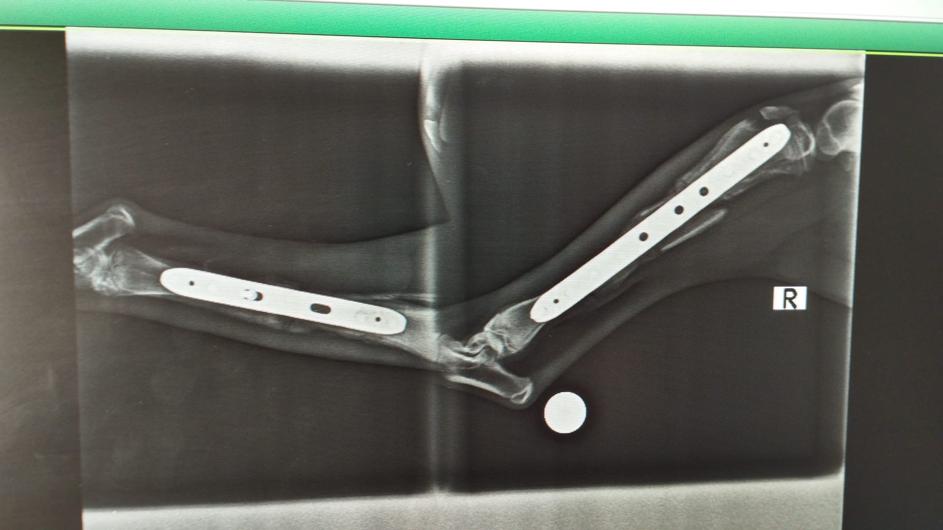 He underwent several surgeries to repair the breaks with the use of plates & he also needed an external fixator.