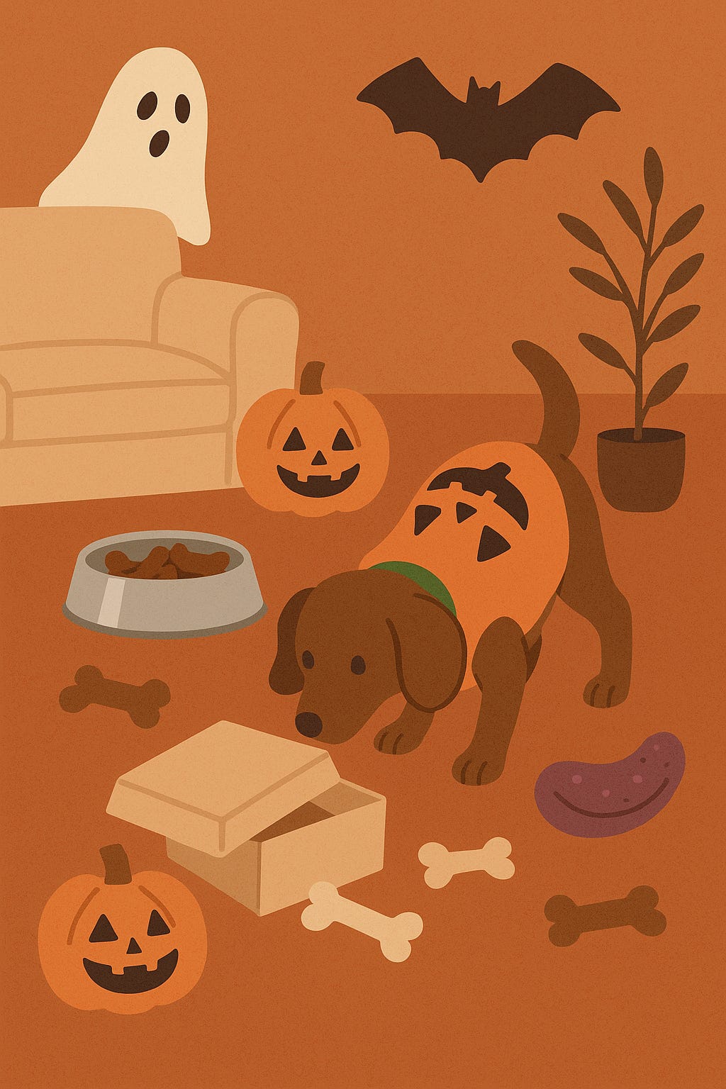 Just remember: loud noises, flashing lights, or moving decorations might scare your dog. Keep the atmosphere fun and relaxed think “cosy Halloween,” not “haunted house.”