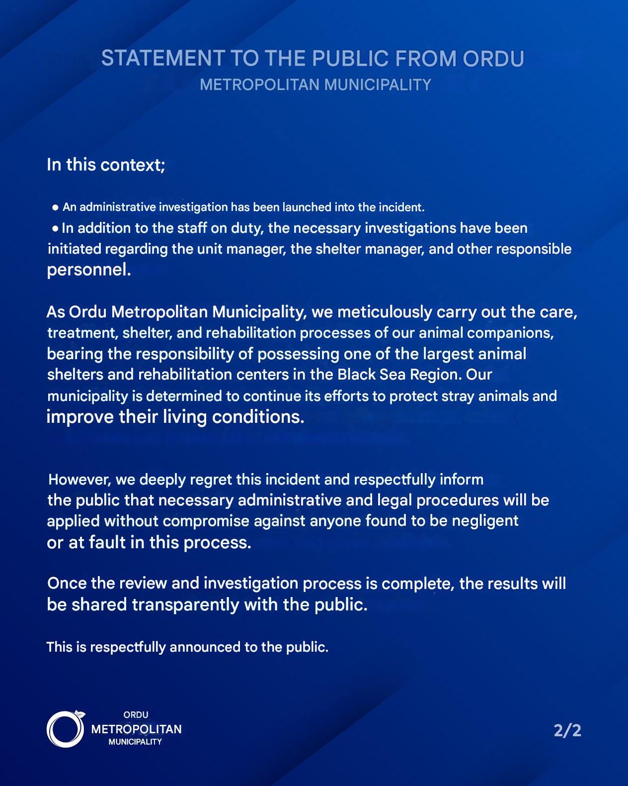 The administrative investigation in Ordu represents an important step toward accountability. Transparency in the process, clear findings, and concrete reforms if needed will be critical not only for the individuals involved in this case but also for wider efforts to ensure humane treatment of animals under municipal care.