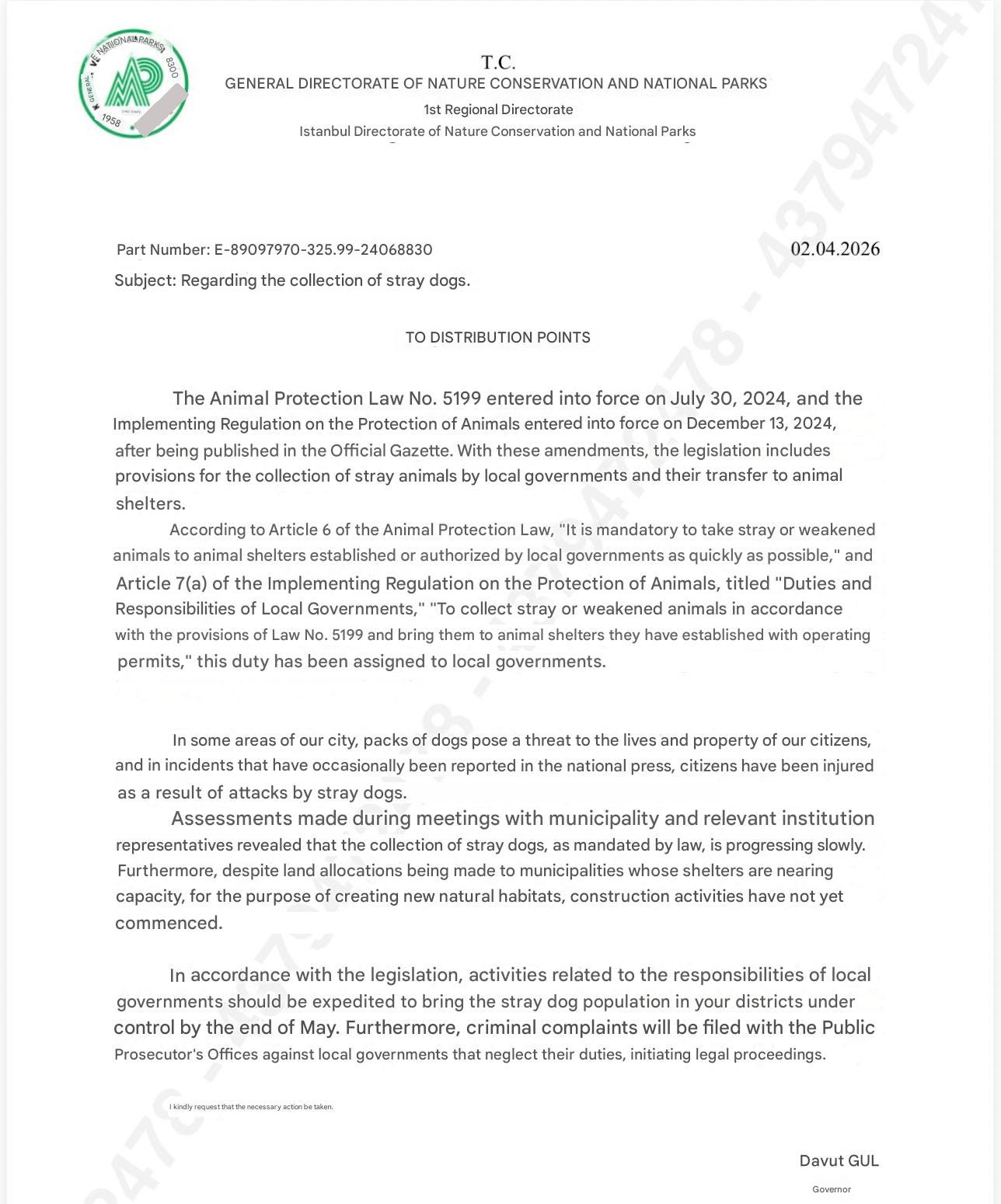 The instruction, signed by Governor Davut Gül, was sent to İstanbul Metropolitan Municipality and district municipalities. It states that local authorities must fulfil their duties regarding stray dogs, and that by the end of May, legal action will be initiated against those who fail to comply.