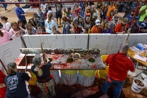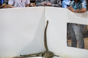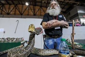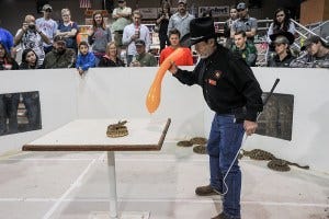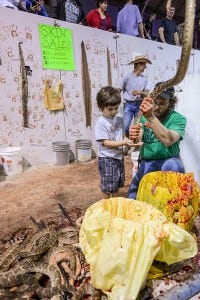 Organisers and supporters of the festival believe that the event is necessary to provide education. In this picture a gentleman is demonstrating how rattlesnakes bite by taunting one of the snakes with an object. The hook he is holding is to control the snake.