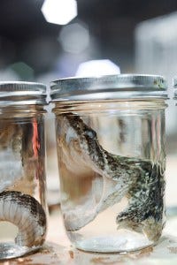 As with most festivals and fairs, souviners are available for attendees to purchase. These pictures show the discarded heads of rattlesnakes preserved in jars, a snake skin cane & rattlesnake earrings.