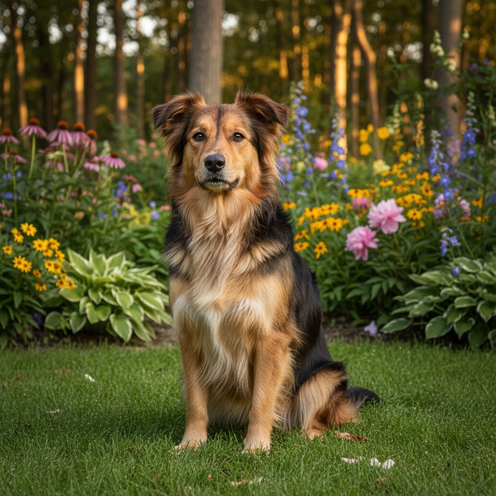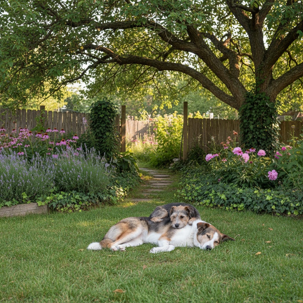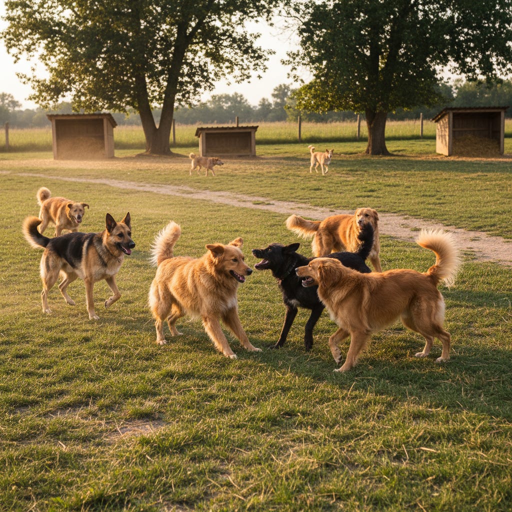 A dog living safely in a sanctuary, surrounded by friends, no longer hungry, cold, or afraid.