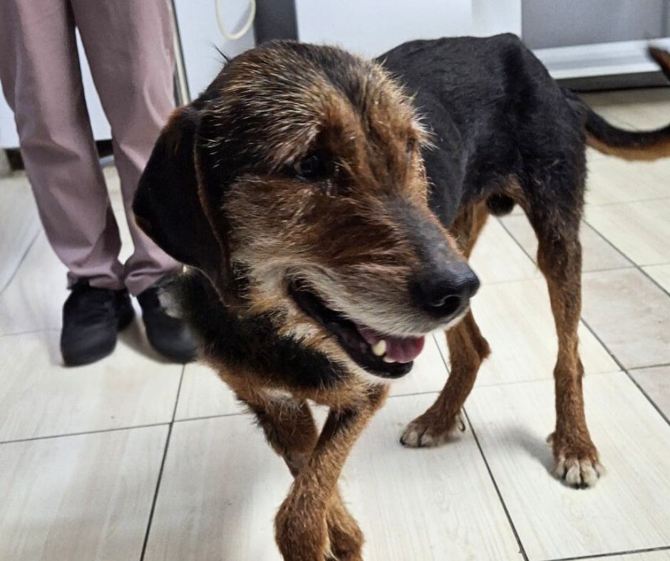 They caught a glimpse from a distance of a black & tan wiry faced little terrier mix & approached slowly, expecting him to bolt if he could but he didn’t. He had an injury to one front leg & while this would have slowed him down it wouldn’t have stopped him heading off in the opposite direction. To the ambulance crews surprise the little dog stood up, stayed rooted to the spot & started barking for them. A welcoming bark, not a “danger, stranger approaching” bark or a “stay away from me “ bark. It was a “please help me bark”