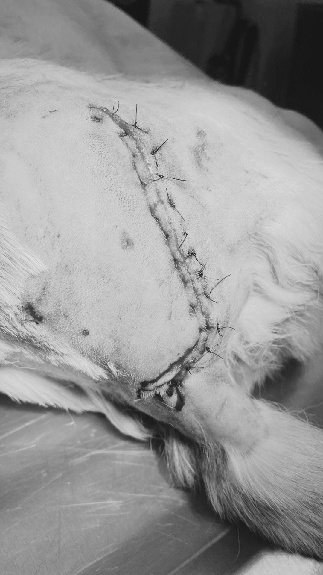 Large. Raw. Angry. The sort of injury that makes you wonder how a dog could possibly keep walking.