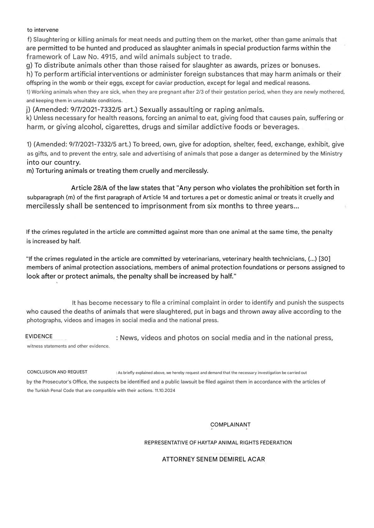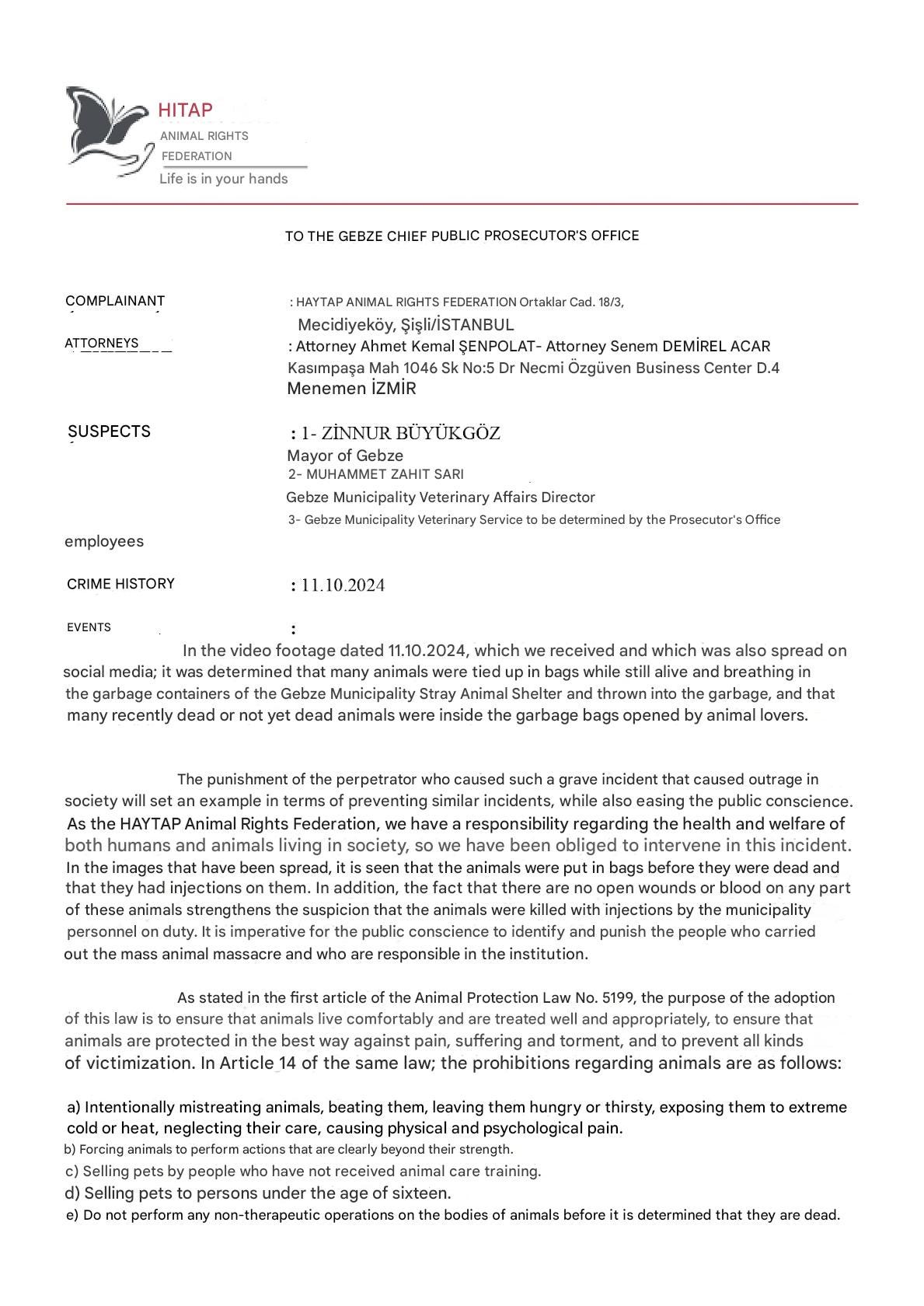 Animal Rights Federation Haytap, who had been present at the scene following the discovery of the animals lodged a complaint with the public prosecutors office.