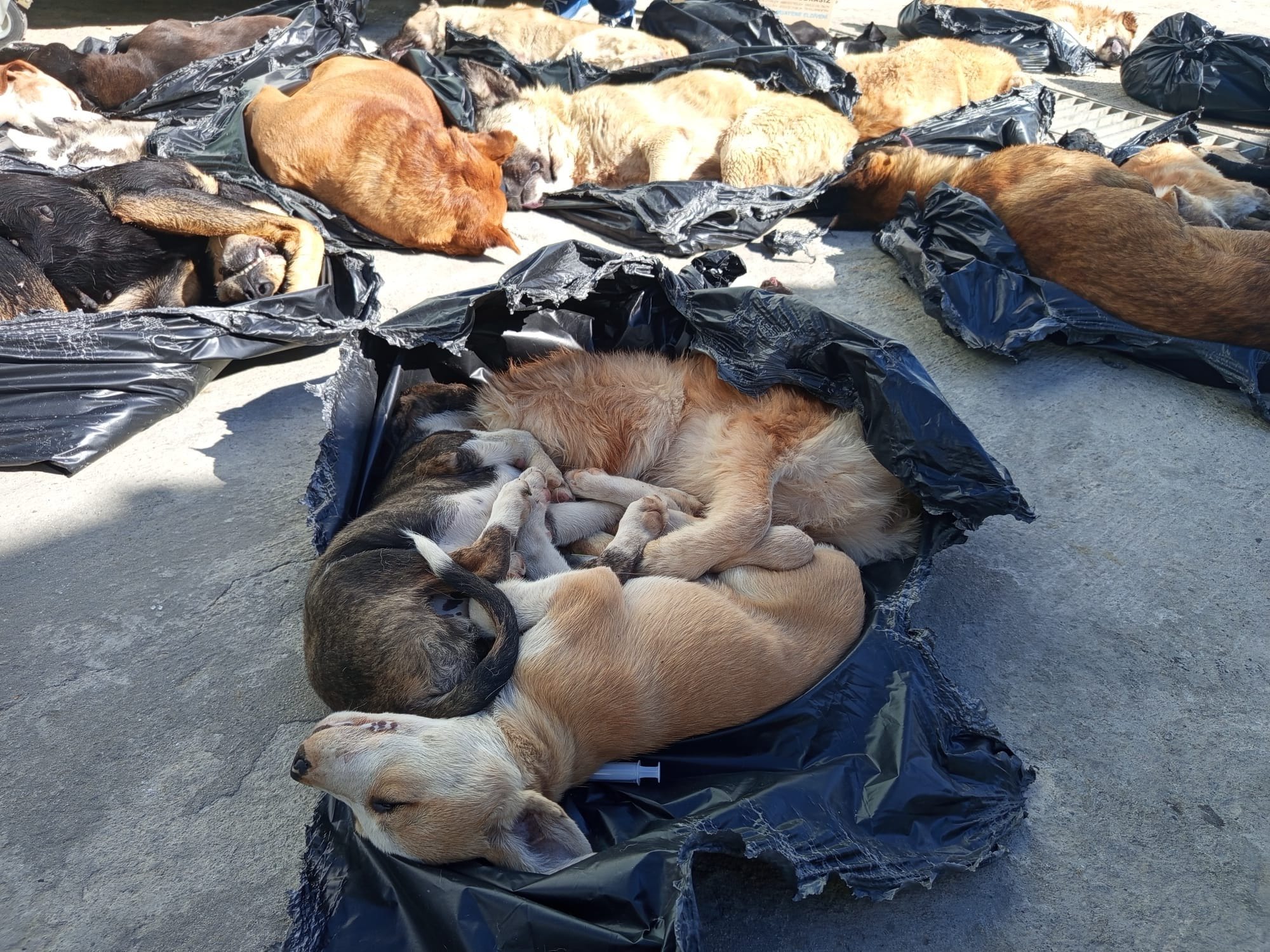In garbage containers they saw numerous black bags with dead dogs & cats inside.