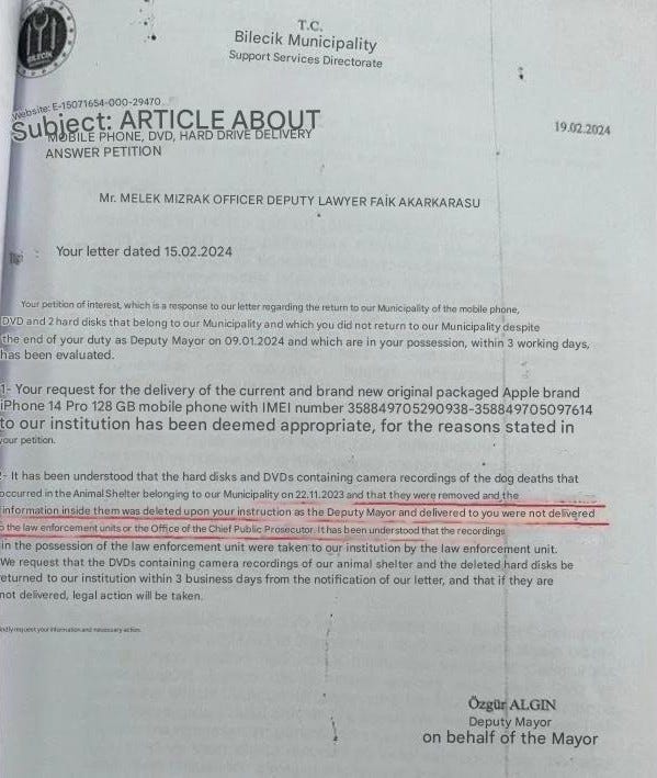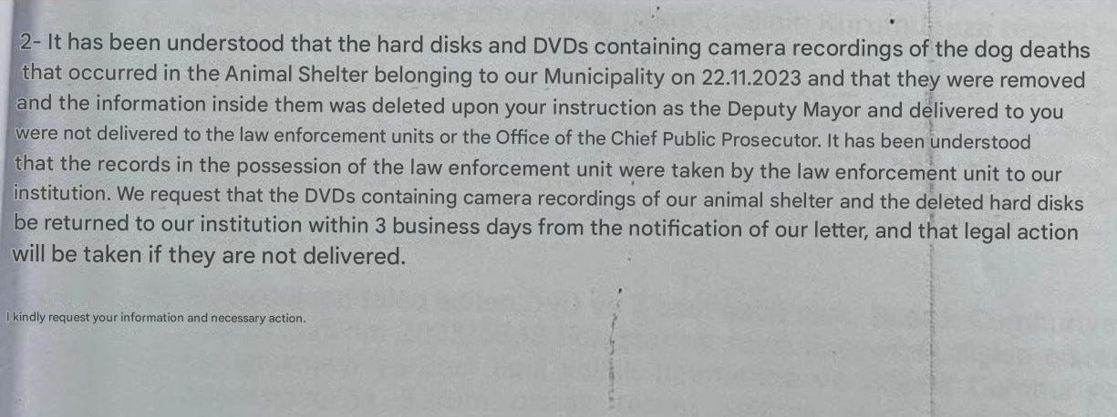 “Upon the instruction of the Mayor’s Office, the images from the recording device disks removed from the animal shelter and replaced with new ones, dated 22.11.2023, were transferred to DVD media, the content of the existing hard disks were erased and cleaned and delivered to the Mayor’s Office together with the DVDs.”