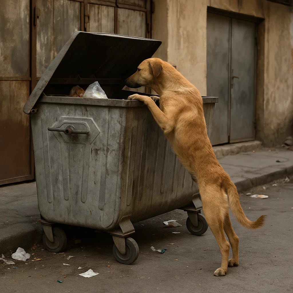 For a dog on the streets, hunger is constant. There are no regular meals, no one filling a bowl twice a day. Instead, survival depends on what scraps can be scavenged. Bins, rubbish heaps, and market stalls offer the slimmest chance of food. Competition is fierce, and often dangerous, as dogs fight over meagre scraps.