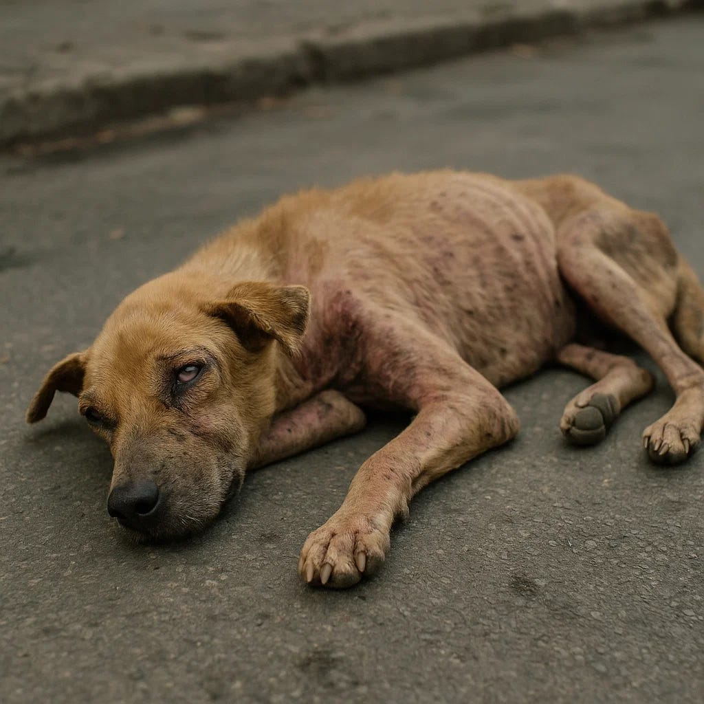 Diseases such as parvovirus, distemper, mange, and leishmaniasis spread unchecked in street populations. A single outbreak can wipe out dozens of dogs. Parasites gnaw away at their health, sapping energy and leaving them with painful skin conditions. For a street dog, sickness is rarely met with treatment, it is endured in silence, until the body gives out.