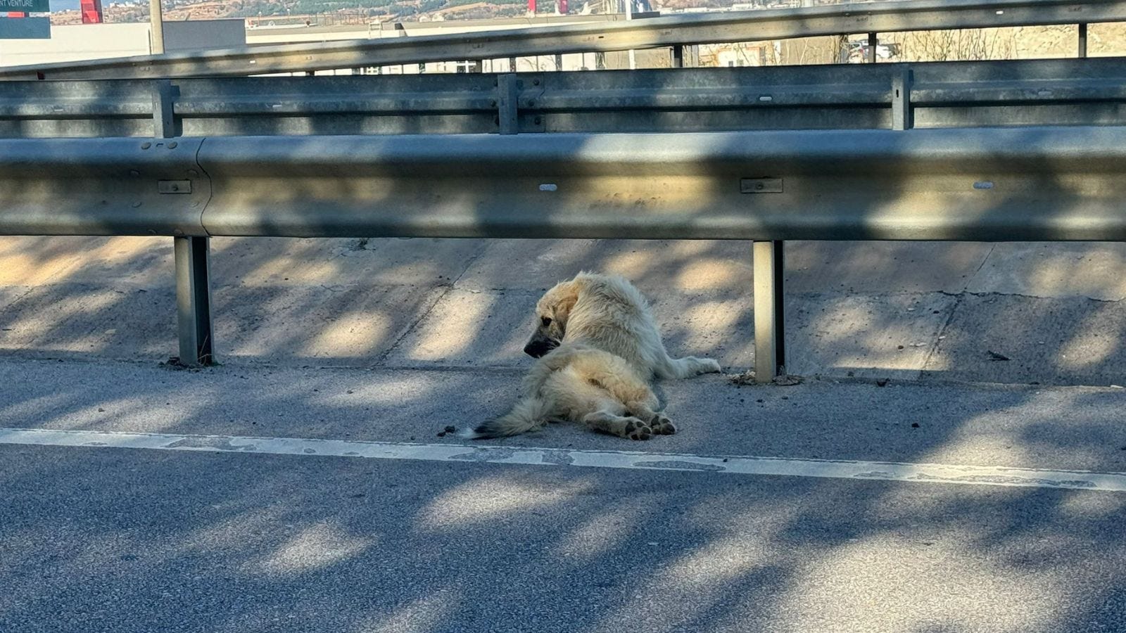 A truck struck a large dog on the highway and simply drove away, leaving the poor dog behind.