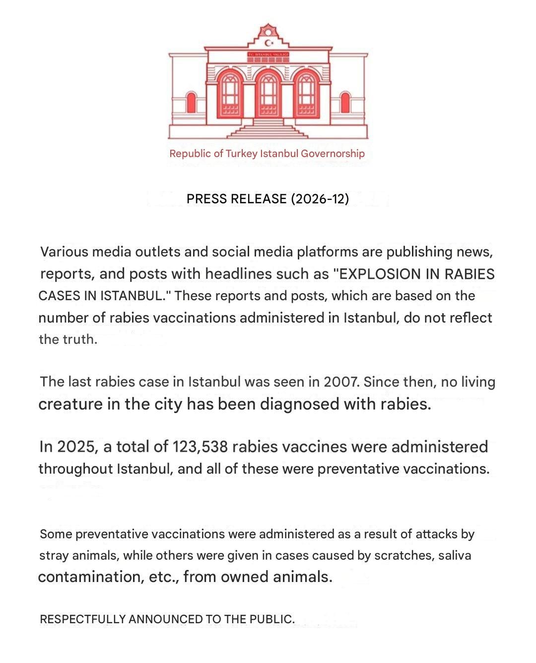 Recently, major news outlets reported that in 2025, approximately 123,538 people in İstanbul sought medical care after potential rabies-risky contact and that over 411,000 doses of rabies vaccine were administered to those individuals. This was based on official health data showing people presented at hospitals after contact with animals like dogs and cats, and that all vaccinations were precautionary, not because actual rabies cases had been confirmed