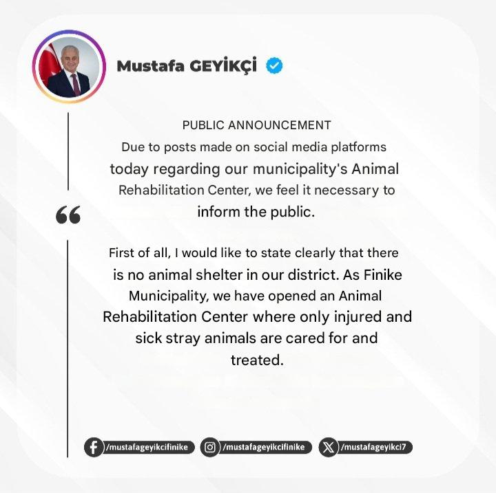 In a public statement, Mayor Mustafa Geyikçi asserted that there is “no animal shelter in our district” and that the municipality operates only an Animal Rehabilitation Center where injured and sick stray animals are cared for and treated.