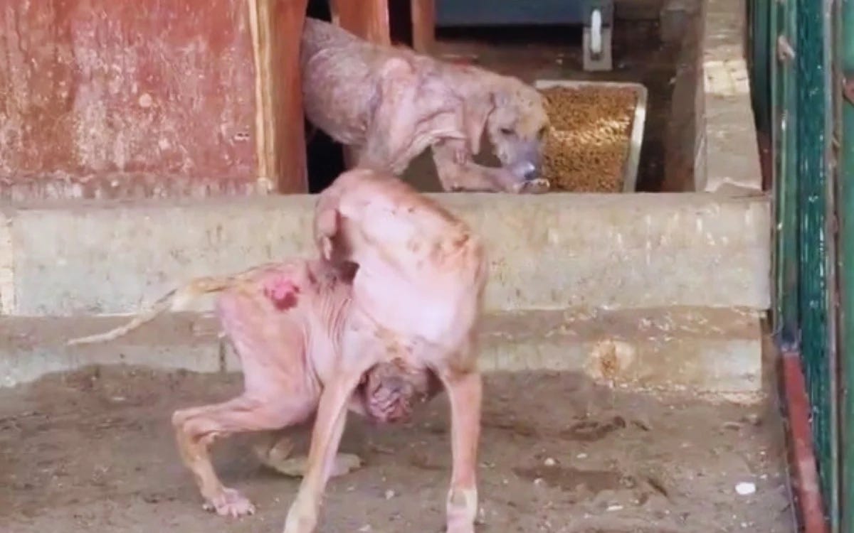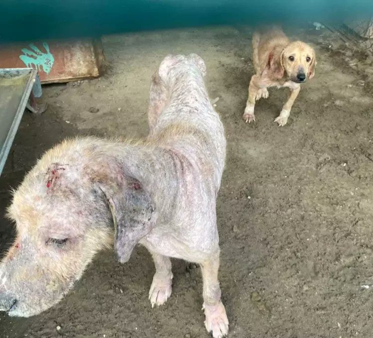 If this is a rehabilitation center, why are so many dogs exhibiting advanced dermatological disease in what appear to be unsanitary, mixed-health enclosures?