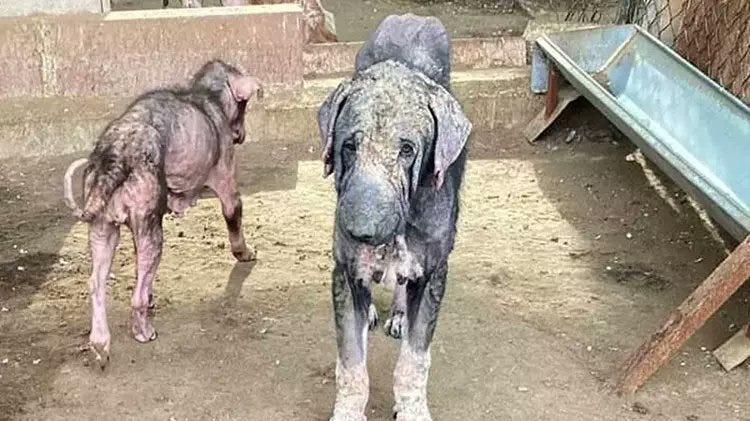 Extensive hair loss and advanced skin disease consistent with mange